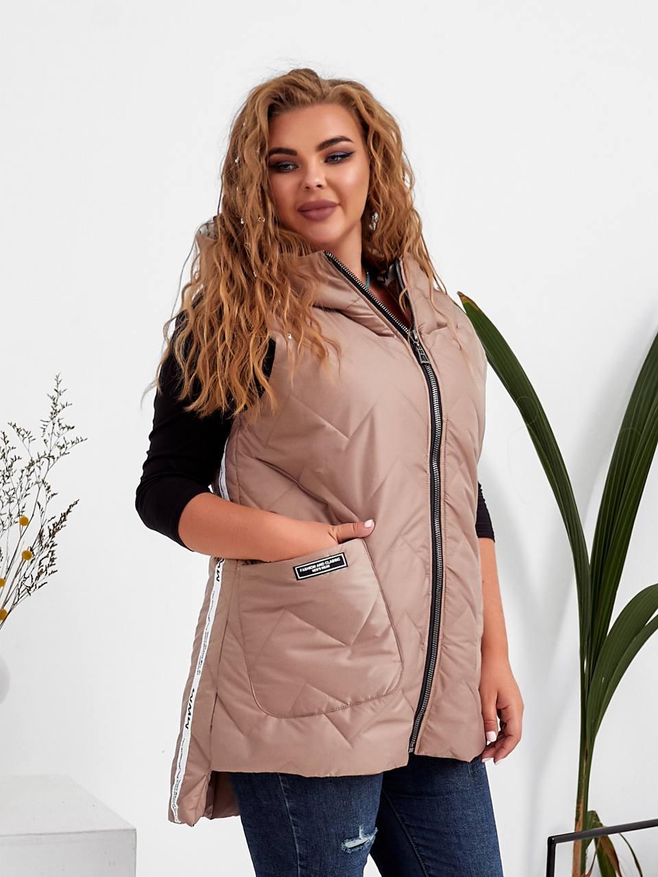 Жіноча подовжена стьобана в ромбик жилетка безрукавка з капюшоном, утеплена синтепоном, великі розміри
