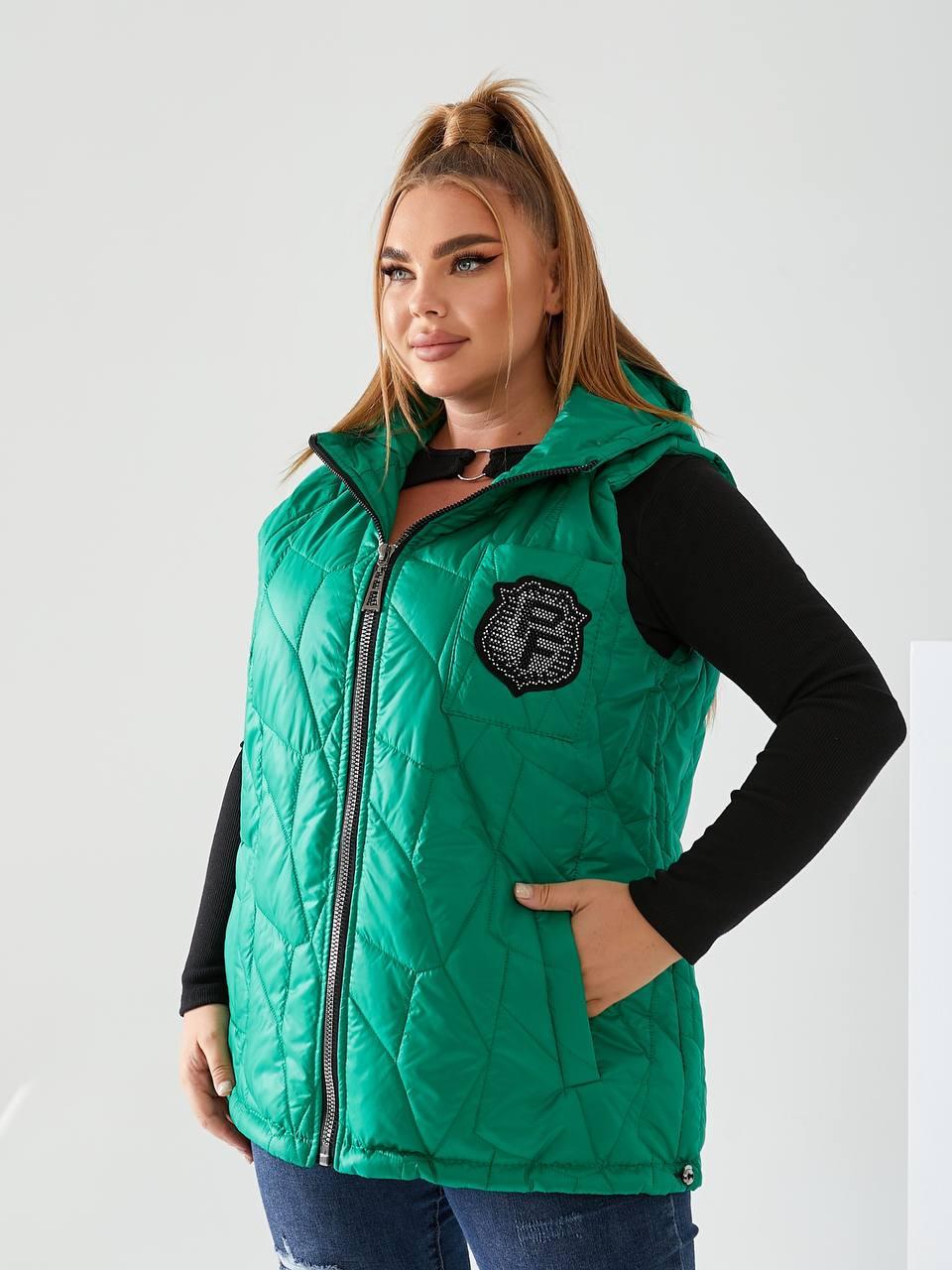 Стильний стьобаний жилет з кишенями, зручний глибокий капюшон, декорований нашивкою з камінням, якісна фурнітура.