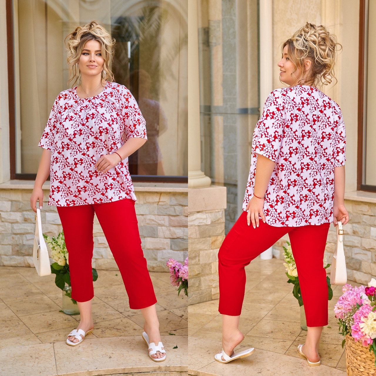 Жіночий літній прогулянковий костюм: блузка з візерунком та вкорочені штани, батал великі розміри