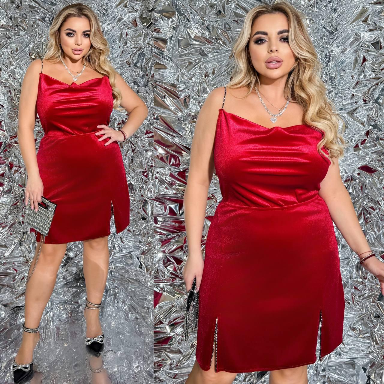 Сяючий звабливий коктейльний костюм: топ з декольте на тонких бретелях та спідниця з розрізами, норма і батал великі розміри